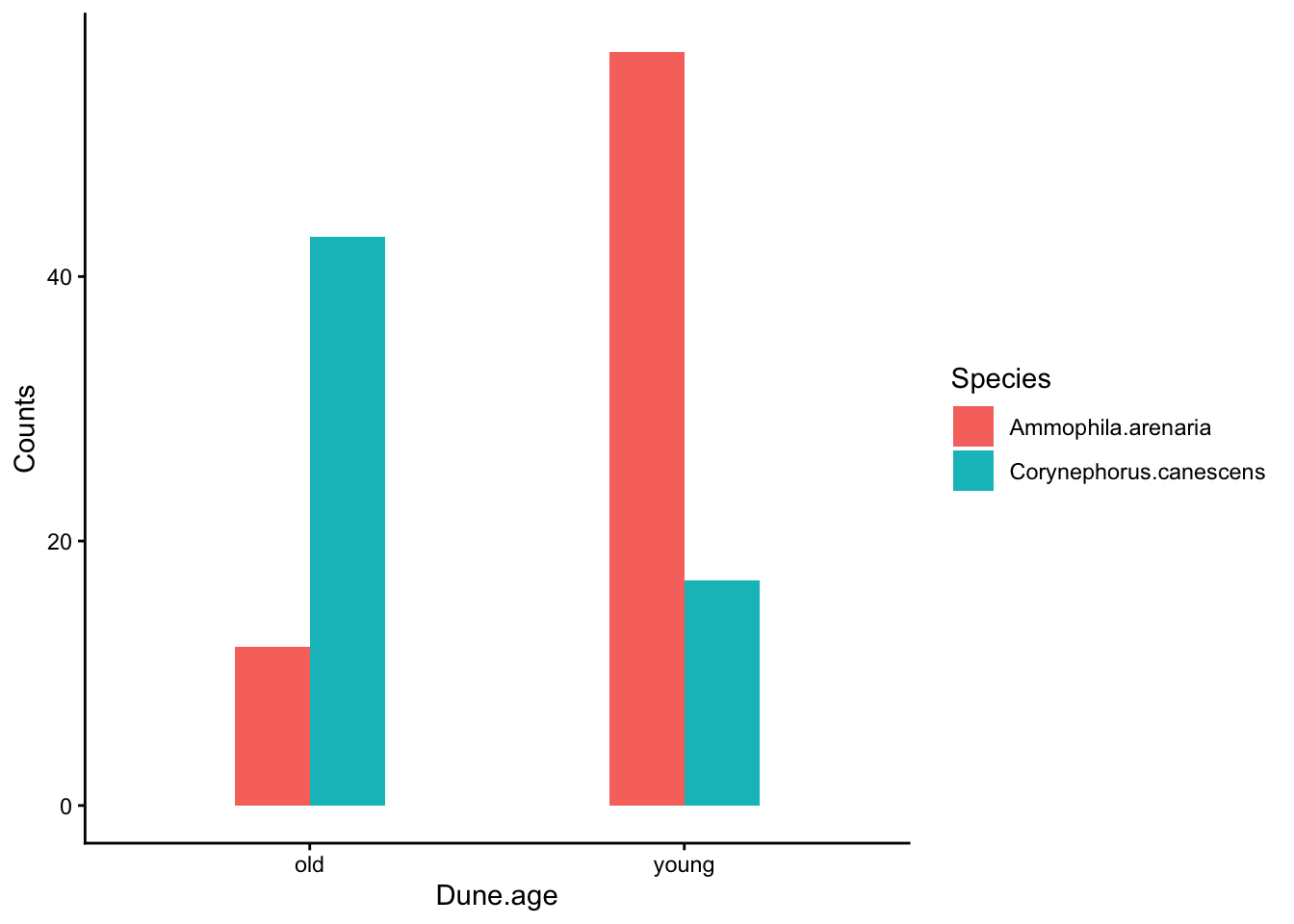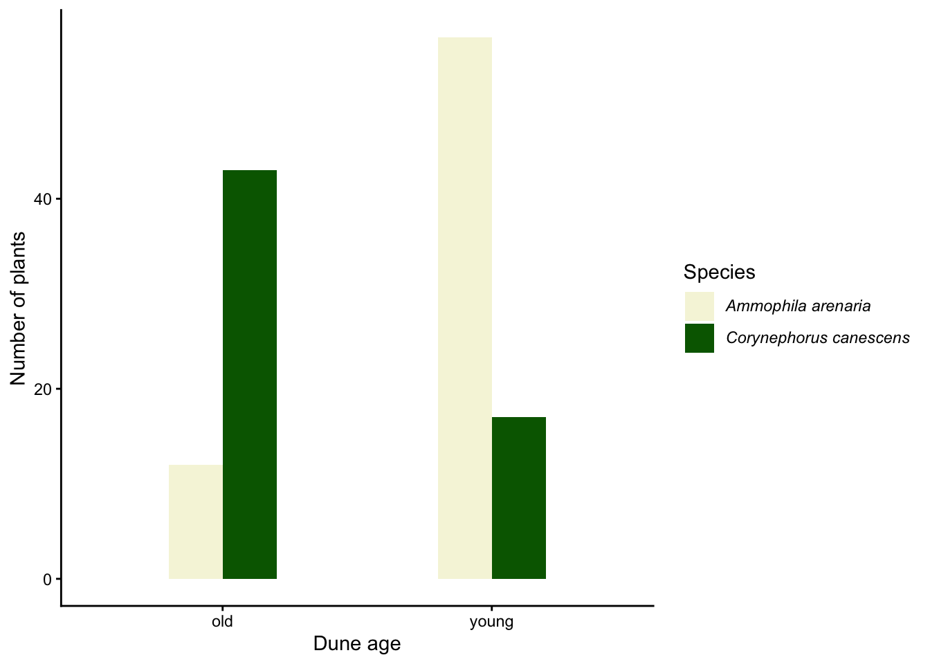 De två gräsarterna är inte slumpmässigt fördelade mellan sanddyner av olika ålder, utan Ammophila arenaria förekommer i högst antal i unga sanddyner, medan Corynephorus canescens är vanligast i gamla sanddyner (\(\chi\) 2 test, \(\chi\) 2 = 36.47, df = 1, p < 0.001).