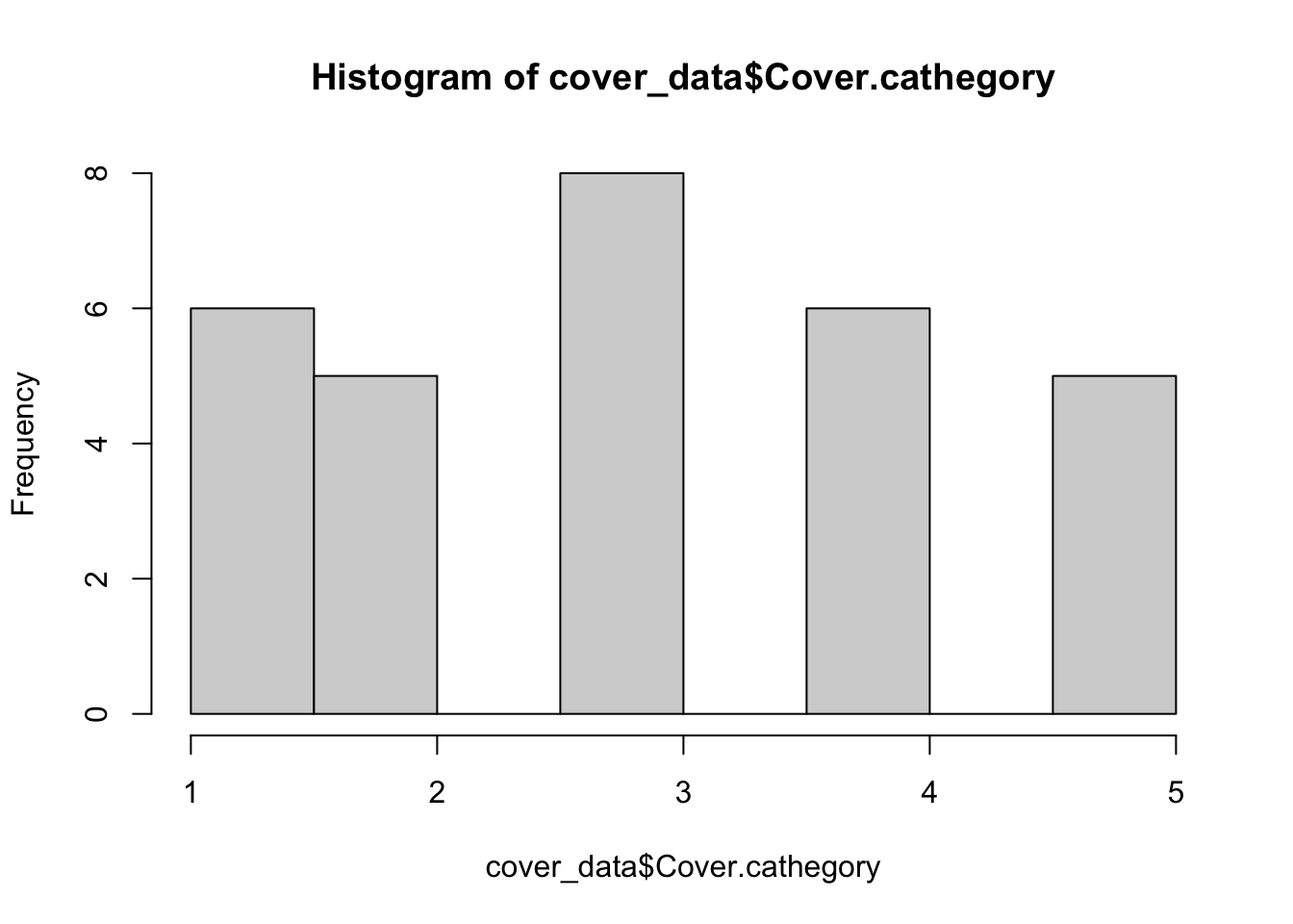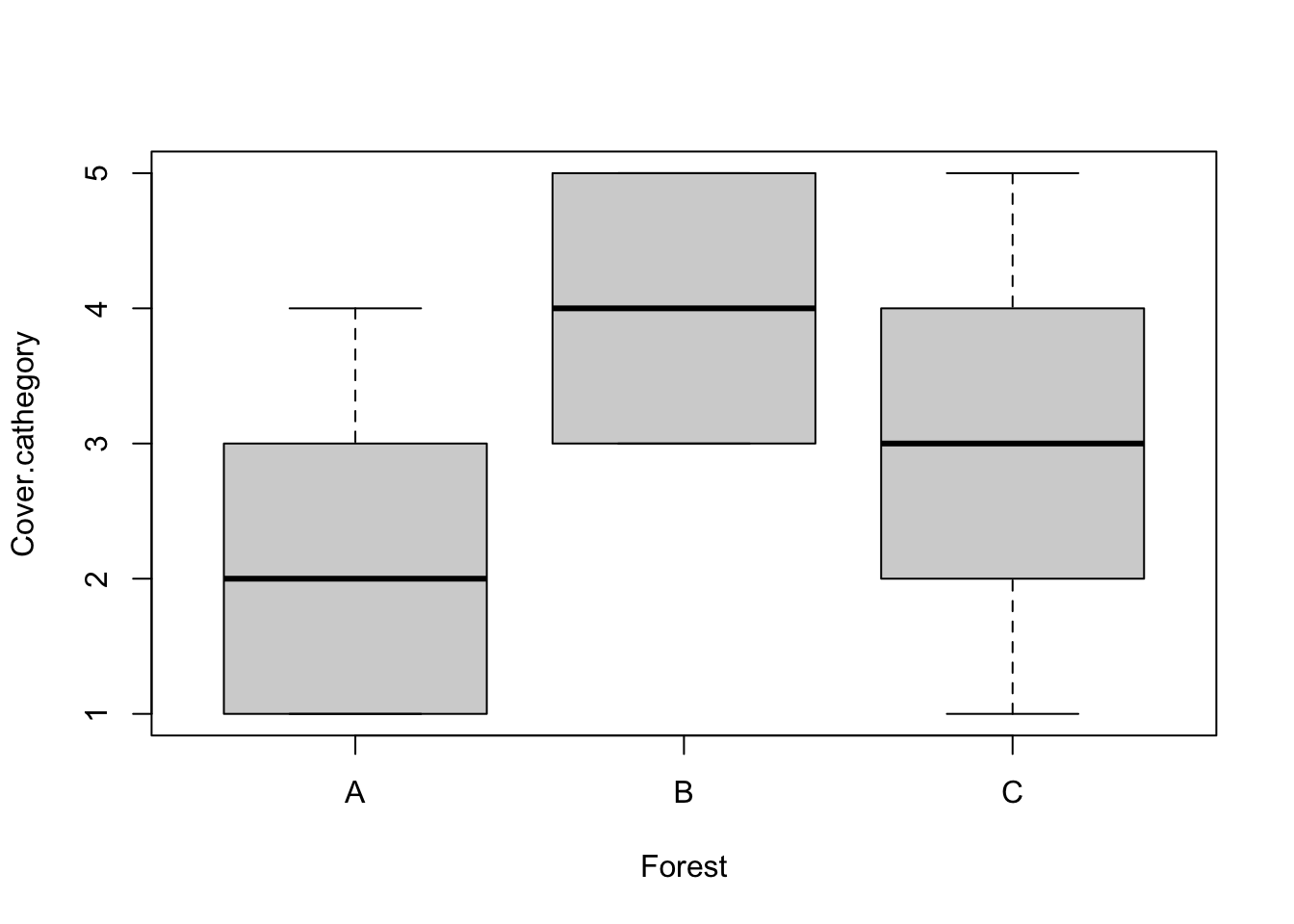 Vi vill nu göra ett Kruskal Wallis test för att undersöka om vår responsvariabel (beroende variabel) Cover.cathegory beror av vår förklarande variabel (oberoende variabel) Forest