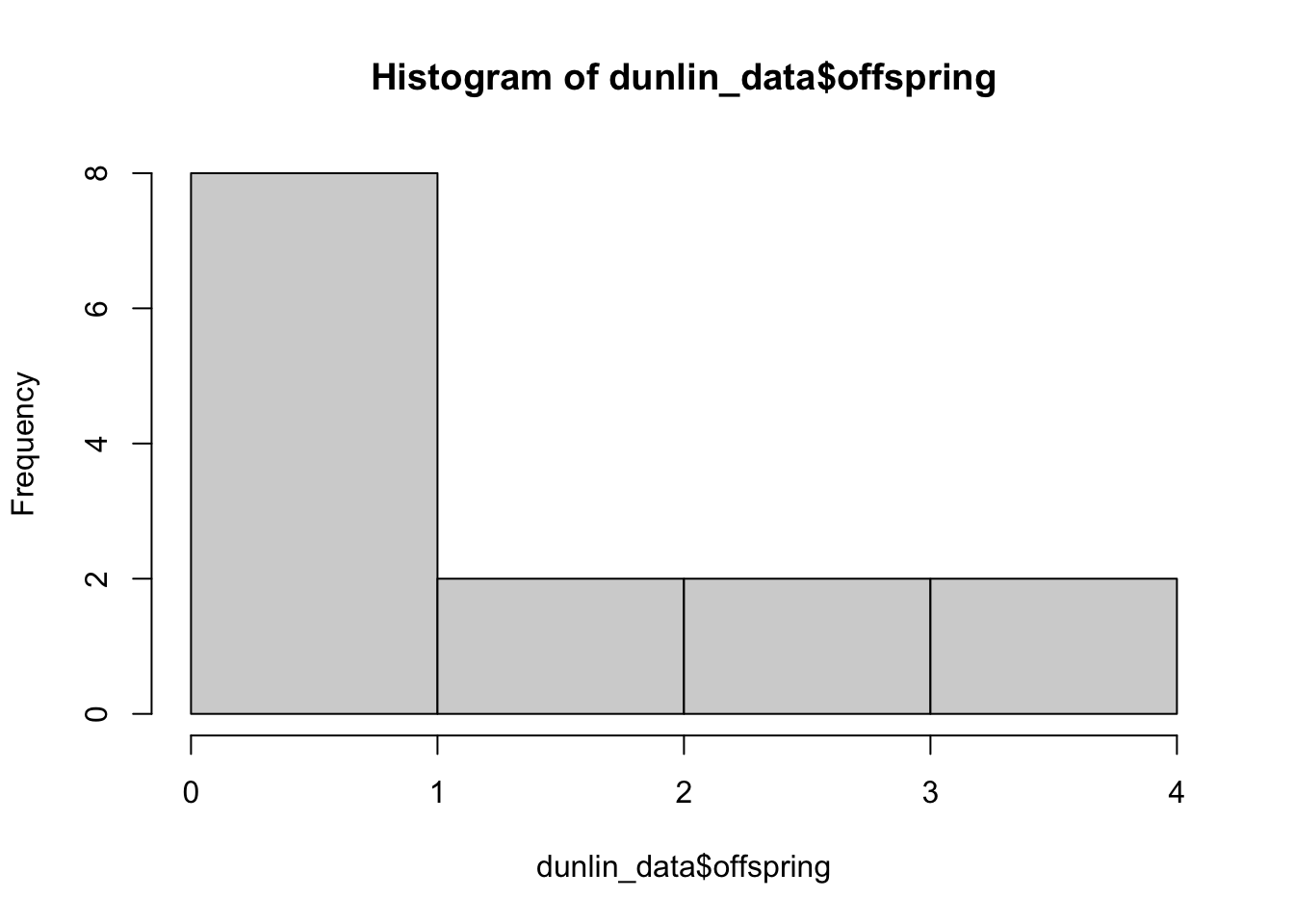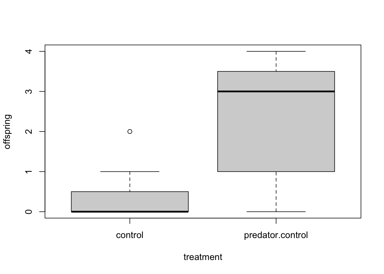 Vi vill nu göra ett Wilcoxons test för att undersöka om vår responsvariabel (beroende variabel) offspring beror av vår förklarande variabel (oberoende variabel) treatment, med andra ord om antalet avkomma beror av huruvida området haft predatorkontroll eller ej